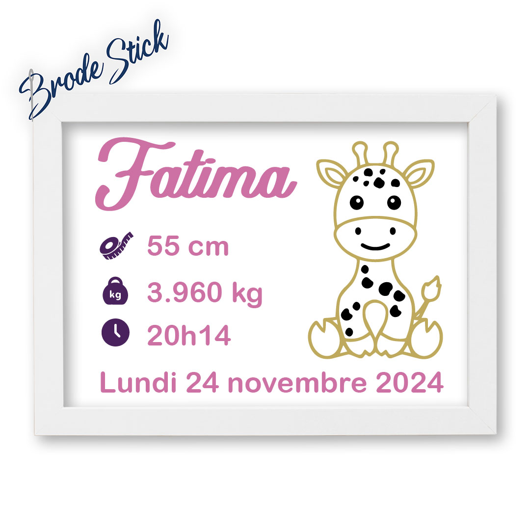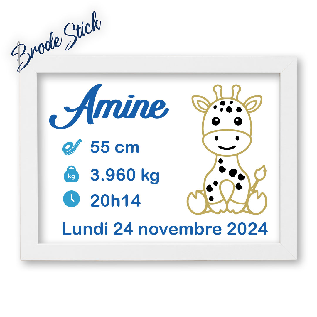 Un design ludique et tendre : Le motif met en scène une adorable girafe aux grands yeux. À ses côtés, nous marquons les informations clés de la naissance : la taille, le poids et l’heure. Le prénom de l’enfant ainsi que sa date de naissance complète viennent souligner cette illustration pour un souvenir inoubliable.