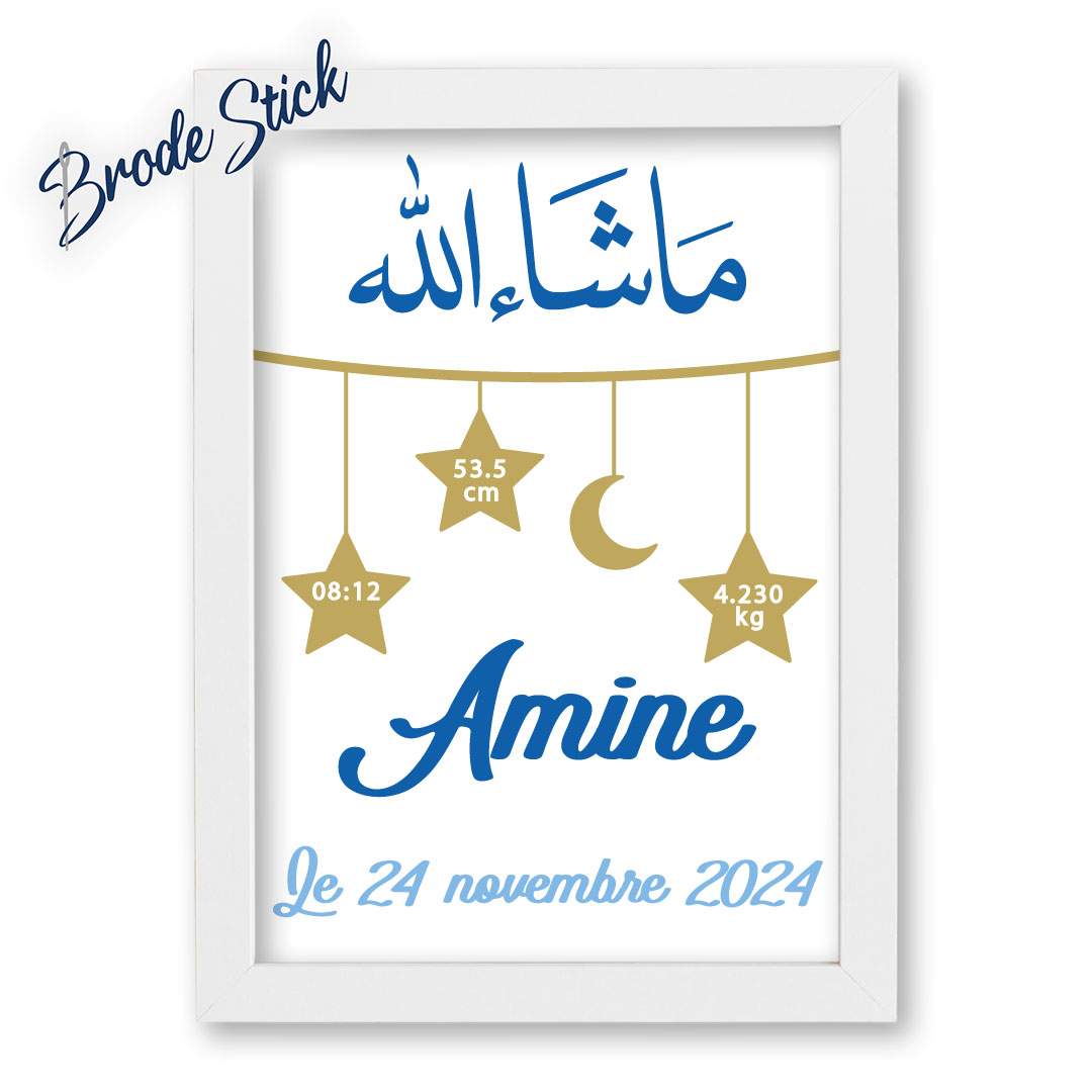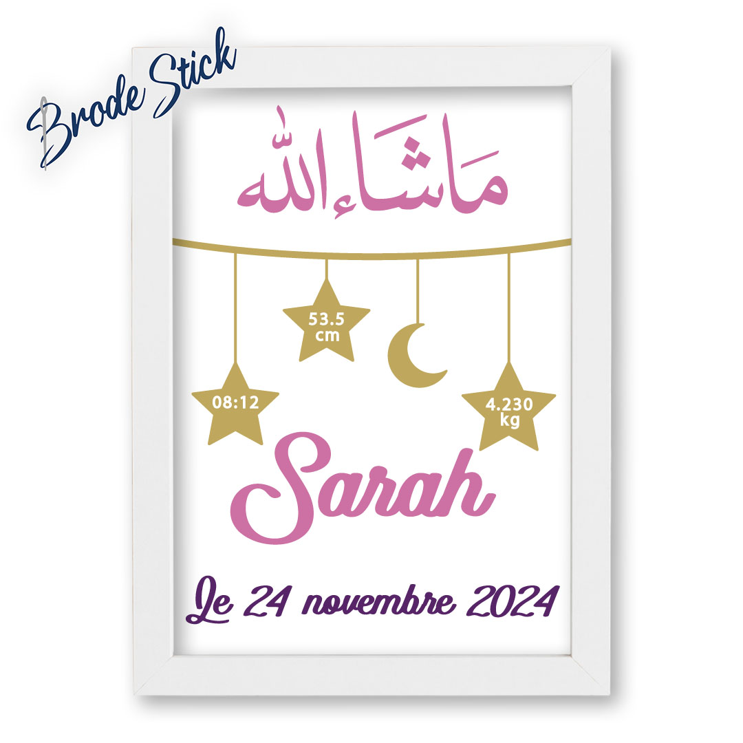 Le motif présente l’inscription “Machaallah” en calligraphie élégante, surmontant une guirlande d’étoiles et un croissant de lune. À l’intérieur des étoiles, nous inscrivons les mesures de naissance : l’heure, la taille et le poids. Le prénom de l’enfant et sa date de naissance viennent compléter cette œuvre protectrice réalisée sur-mesure.